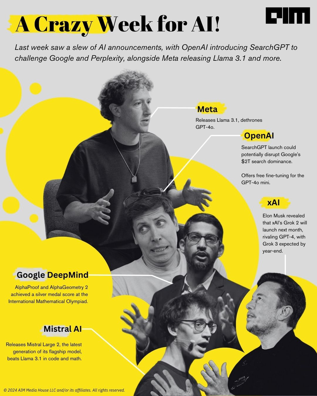 What a crazy week it was for artificial intelligence! OpenAI launched SearchGPT, challenging Google's $2T monopoly. Meta released Llama 3.1, and Mistral AI introduced Mistral Large 2 with groundbreaking advancements. Elon Musk announced Grok 2 and 3, aiming to surpass GPT-4. Google DeepMind's AlphaProof and AlphaGeometry 2 won silver at the International Math Olympiad.Â